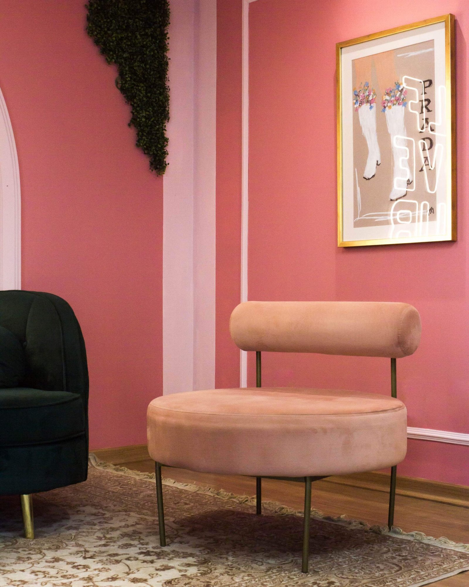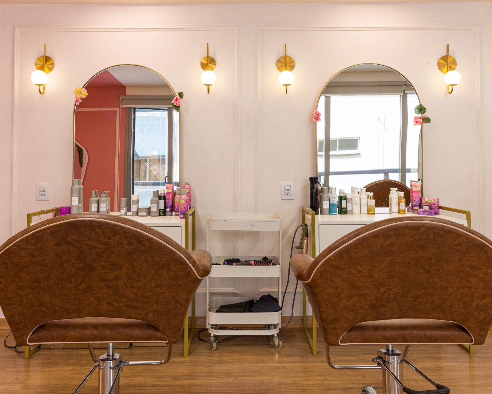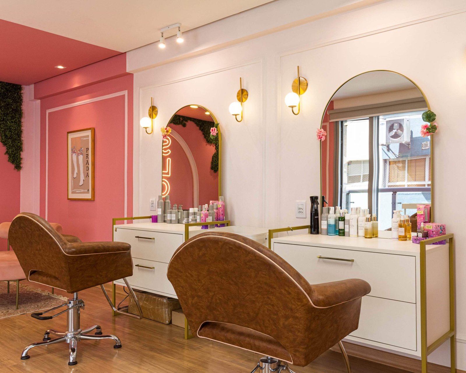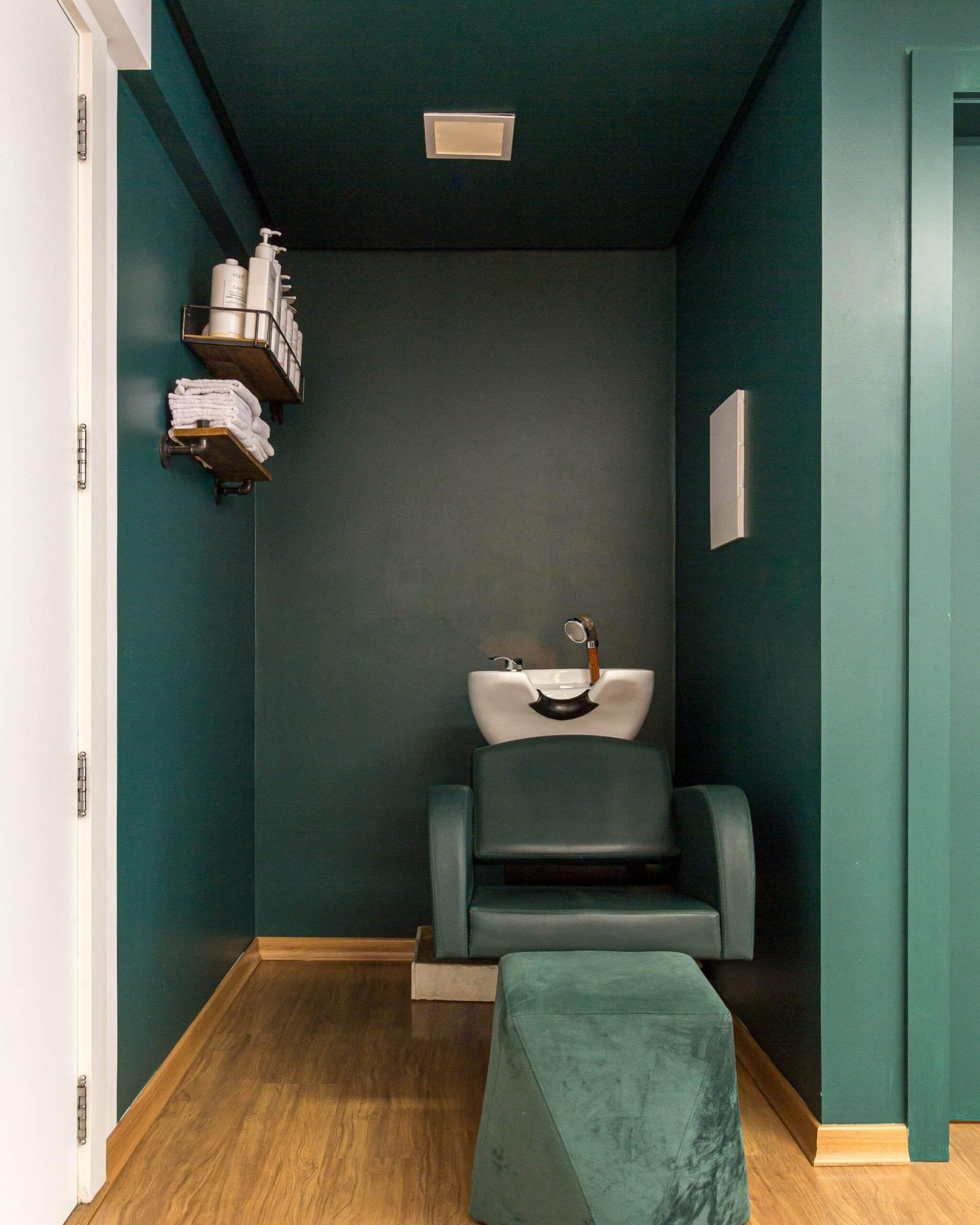 Em uma nova sala, no mesmo prédio, cria-se o espaço de salão de beleza que traz a mesma identidade do projeto originário, mesma leitura de cores e conceito, misturando o design vintage Art Déco com Contemporâneo, sem que fique clichê.